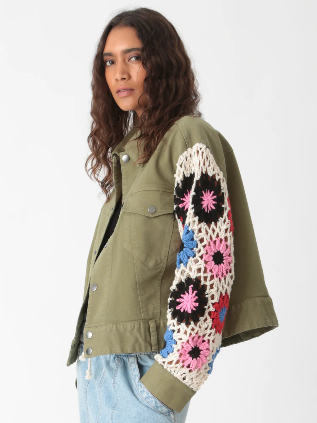 A classic utility style with multi colored floral crochet sleeves and and a twill body. You’ll love the Decklyn jacket. Pairs well with Easy pants over your favorite dress.